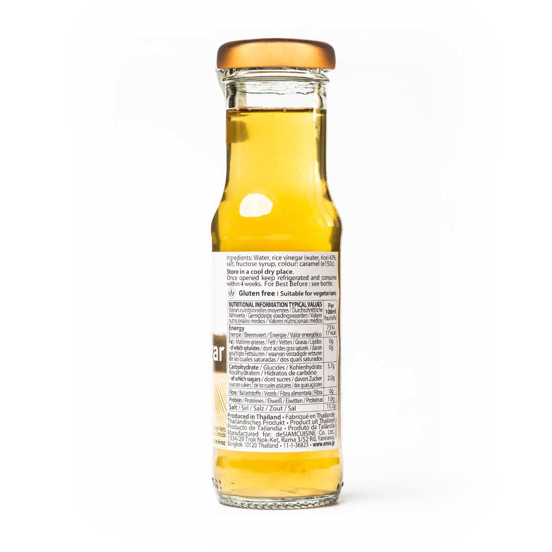 ส่วนผสม: น้ำ, น้ำส้มสายชูข้าว (น้ำ, ข้าว) 42.00%, เกลือ, น้ำเชื่อมฟรุกโตส, สี: คาราเมล (E150c)