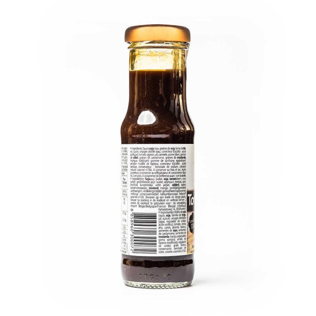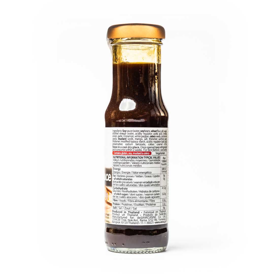 ส่วนผสม: น้ำตาล, ซอสถั่วเหลือง (น้ำ, ถั่วเหลือง, แป้งสาลี, เกลือ, น้ำตาล), น้ำ, น้ำ, น้ำส้มสายชูกลั่น (น้ำ, สารควบคุมความเป็นกรด: กรดอะซิติก), มะเขือเทศ, หัวหอม, กระเทียม, อบเชย, พริกไทยขาว, เมล็ดขึ้นฉ่าย, เมล็ดกระวาน, เมล็ดมัสตาร์ด, มะม่วง, เกลือ, สารเพิ่มความข้น: ซานแทนกัม, สารเพิ่มความข้น: แป้งมันสำปะหลังแปรรูป, สารควบคุมความเป็นกรด: กรดแลคติก, สารกันบูด: โซเดียมเบนโซเอต, สี: คาราเมล E150C